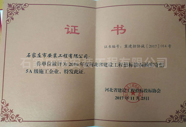 2016年度河北省建設(shè)工程招標(biāo)投標(biāo)誠實(shí)守信5A級施工企業(yè)